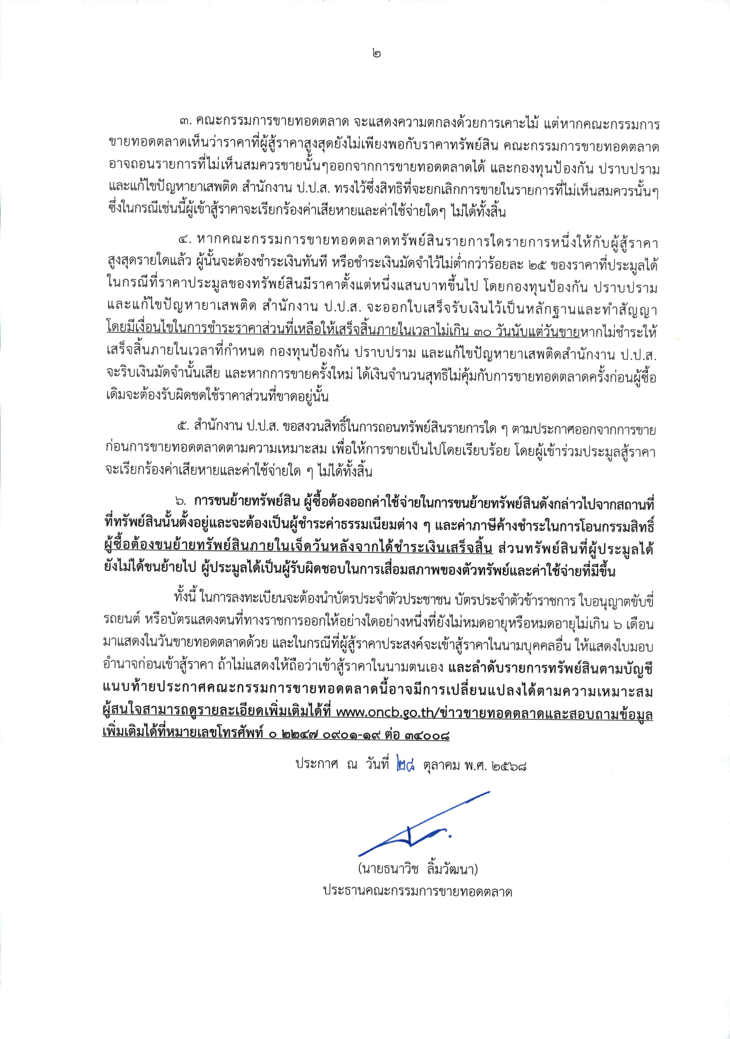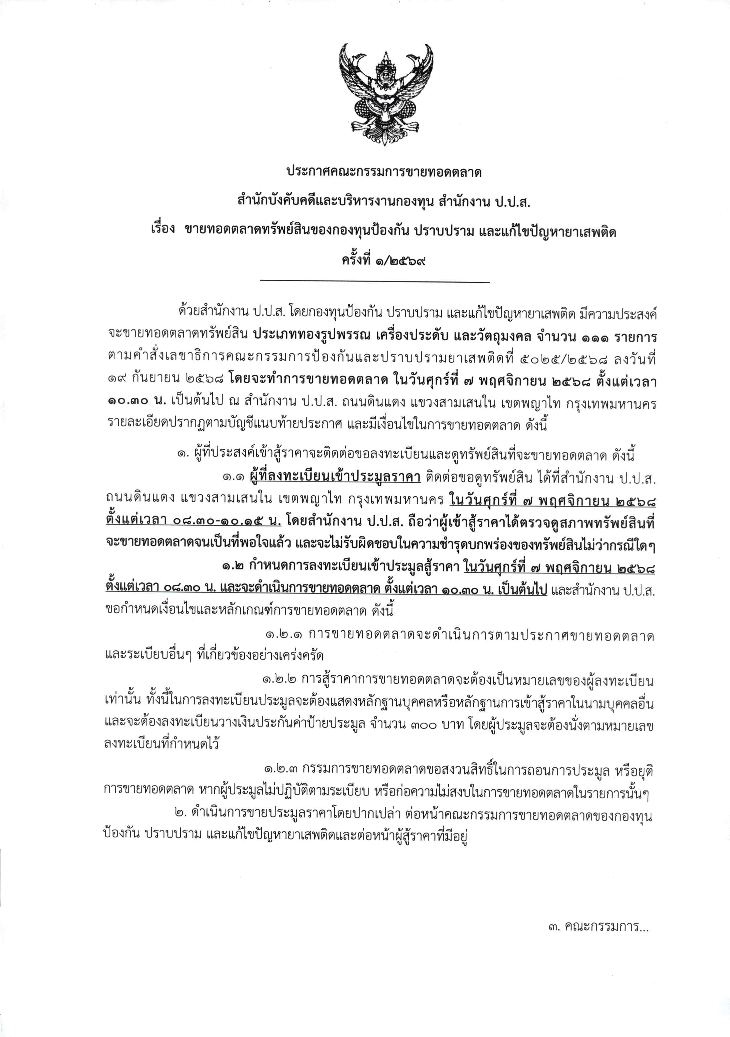 คณะกรรมการป้องกันและปราบปรามยาเสพติดที่ 5025/2568 ลงวันที่ 19 กันยายน 2568 โดยจะทำการขายทอดตลาดในวันศุกร์ที่ 7 พฤศจิกายน 2568 ตั้งแต่เวลา 10.30 น. เป็นต้นไป ณ สำนักงาน ป.ป.ส. ถนนดินแดง แขวงสามเสนใน เขตพญาไท กรุงเทพมหานคร รายละเอียดปรากฏตามบัญชีแนบท้ายประกาศ และมีเงื่อนไขในการขายทอดตลาด ดังนี้