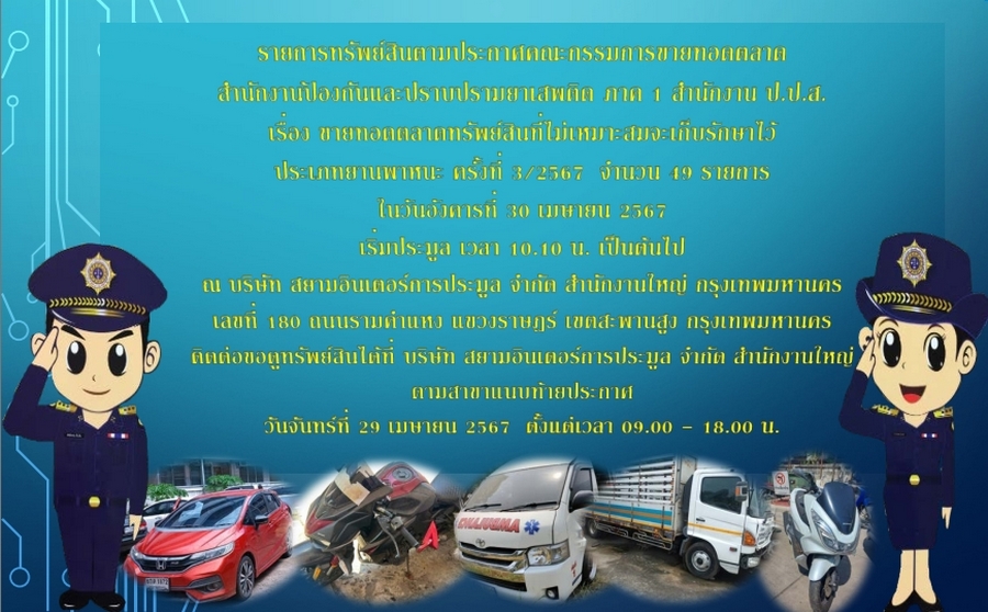 ในวันอังคารที่ 30 เมษายน 2567 เริ่มทำการประมูลตั้งแต่เวลา 10.10 น. เป็นต้นไป ณ บริษัท สยามอินเตอร์การประมูล จำกัด สำนักงานใหญ่กรุงเทพมหานคร เลขที่ 180 ถนนนรามคำแหง แขวงราษฎร์พัฒนา เขตสะพานสูง กรุงเทพมหานคร รายละเอียดปรากฏตามบัญชีแนบท้ายประกาศ และมีเงื่อนไขในการขายทอดตลาด ผู้ประสงค์จะเข้าสู้ราคาสามารถติดต่อขอดูทรัพย์สินที่จะขายทอดตลาดได้ ณ สถานที่เก็บรักษาบริษัท สยามอินเตอร์การประมูล จำกัด และสาขาของบริษัท สยามอินเตอร์การประมูล จำกัด ในวันจันทร์ที่ 29 เมษายน 2567 ตั้งแต่เวลา 09.00 น.- 18.00 น. รายละเอียดทรัพย์สินดังกล่าวปรากฏตามแผนที่ตั้งของบริษัท สยามอินเตอร์การประมูล จำกัด