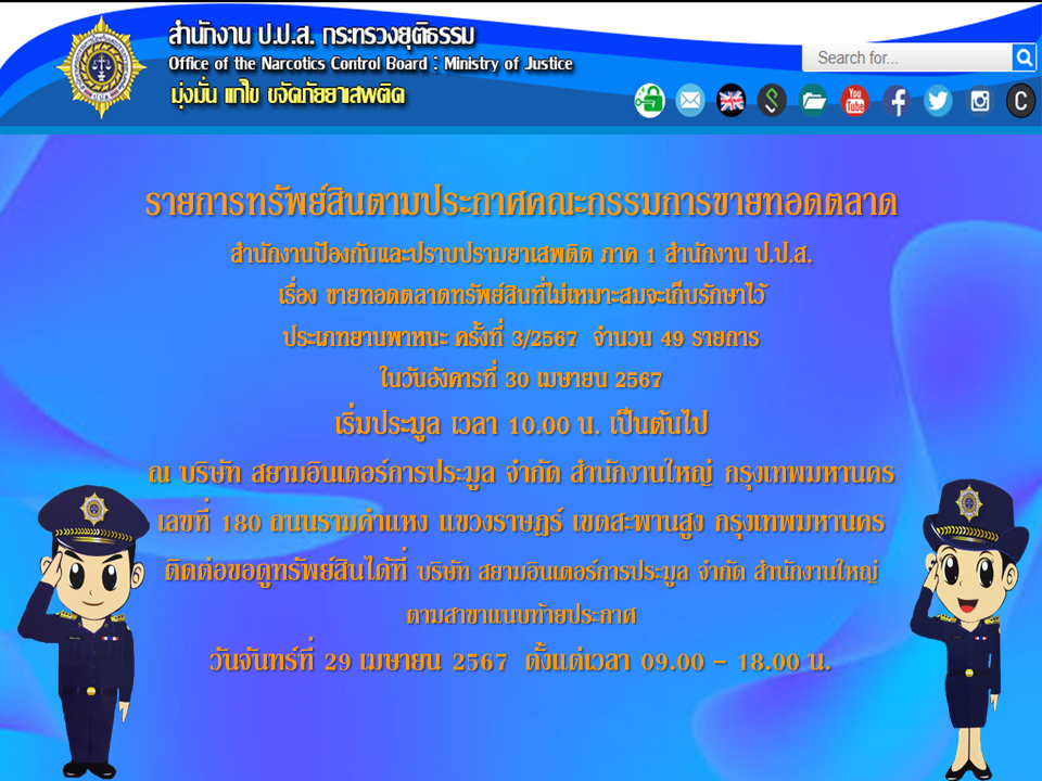 สำนักงานป้องกันและปราบปรามยาเสพติด ภาค 1 มีความประสงค์ จะขายทอดตลาดทรัพย์สินที่ไม่เหมาะสมจะเก็บรักษาไว้ ตามคำสั่งเลขาธิการ ป.ป.ส.