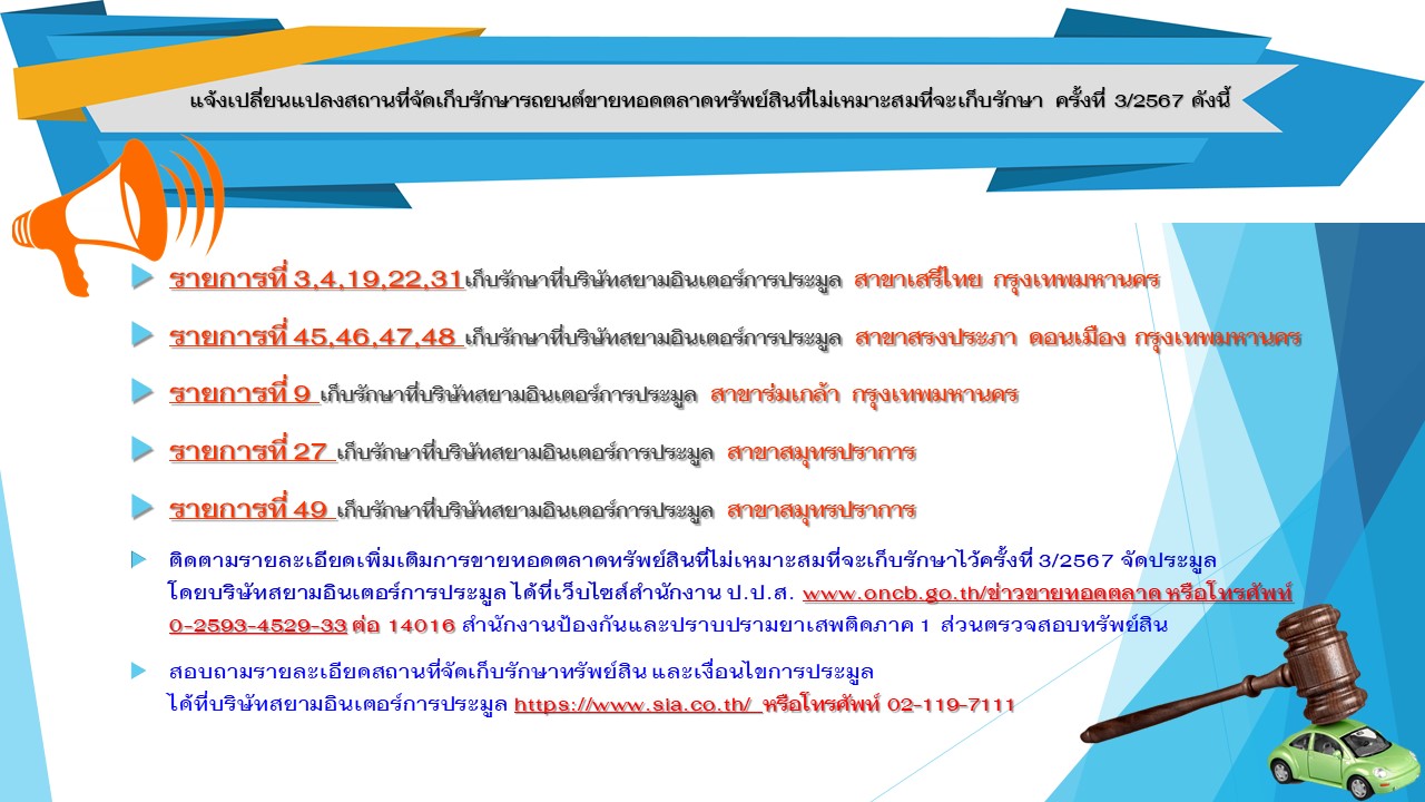 ได้มอบหมายให้ บริษัท สยามอินเตอร์การประมูลจำกัด เป็นผู้ดำเนินการขายทอดตลาดทรัพย์สินประเภทยานพาหนะ ในวันอังคารที่ 30 เมษายน 2567