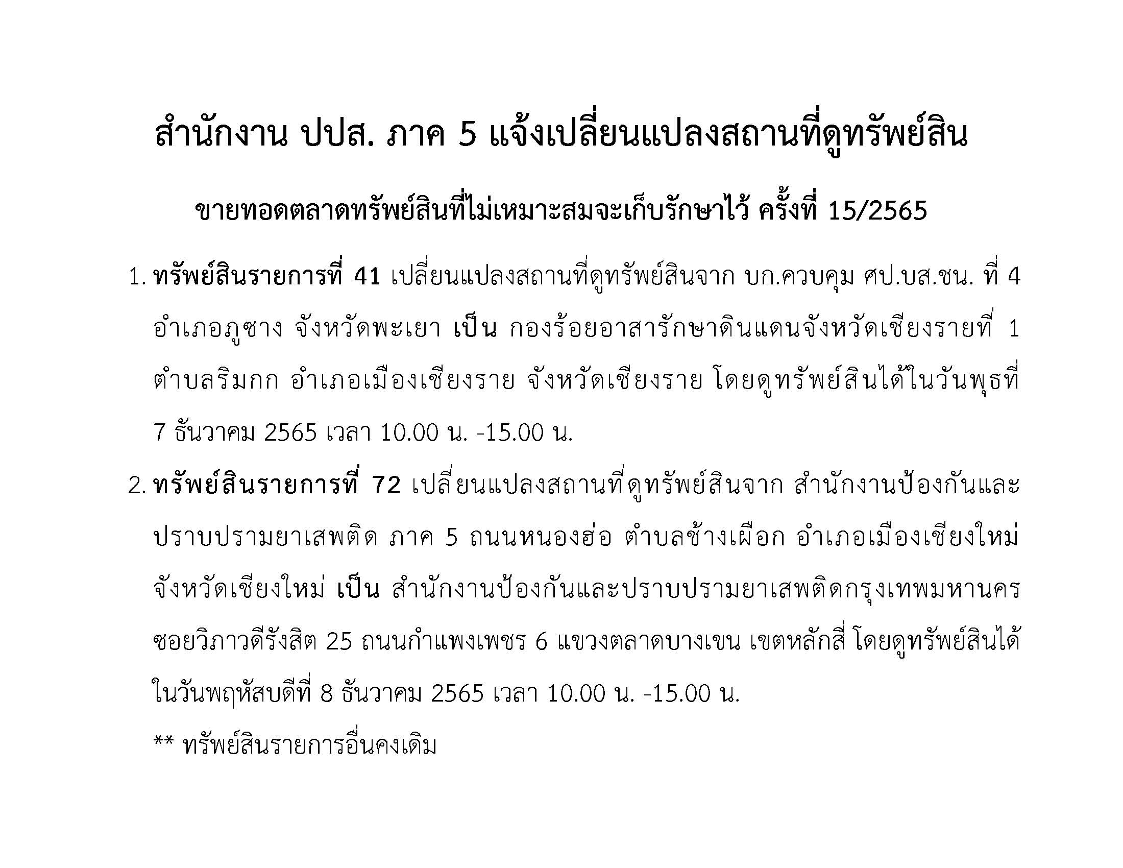1.3 ดูทรัพย์สินรายการที่ 41 ณ บก.ควบคุม ศป.บส.ชน. ที่ 4 อำเภอภูซาง จังหวัดพะเยา ในวันพุธที่ 7 ธันวาคม 2565 ตั้งแต่เวลา 10.00 น. ถึงเวลา 15.00 น.
